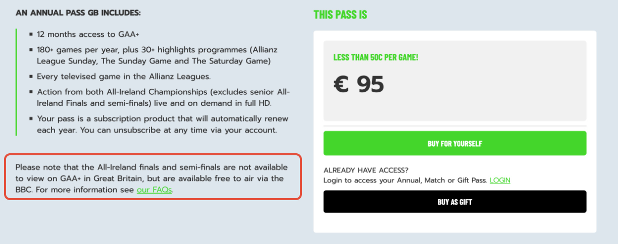 Due to rights restrictions games televised by BBC (approximately 6 games throughout the season including the All-Ireland Semi and Finals) cannot be viewed on our service by users based in Great Britain therefore, access to these games is not included in this pass and is reflected in the price.